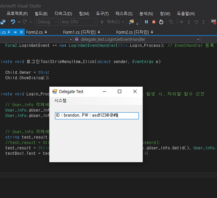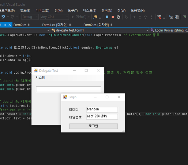 Form2.LoginGetEvent += new LoginGetEventHandler(this.Login_Process); // EventHandler 등록