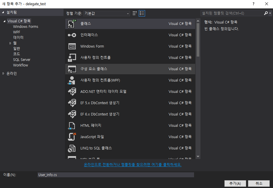 클래스를 선택 후에 입력할 사용자 정보를 관리할 'User_Info.cs' 파일을 추가한다.