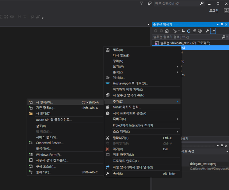 오른쪽 솔루션 탐색기에서 프로젝트 명의 오른쪽 클릭 후 [ 추가(D) ] - [ 새 항목(W) ]을 선택한다.