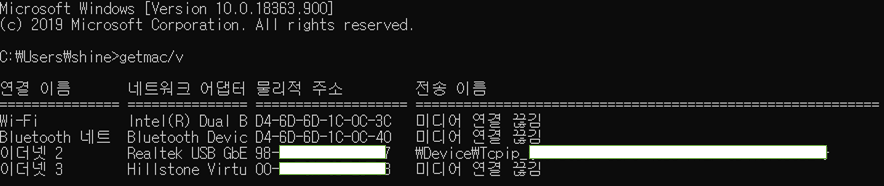 [ 방법 1 ]을 사용했을 때는 '이더넷 3'인 가상 네트워크 어댑터의 MAC주소를 가져왔지만, [ 방법 2 ]를 사용했을 경우에는 현재 사용중인 '이더넷 2' 네트워크 어댑터의 MAC주소를 가져왔다.