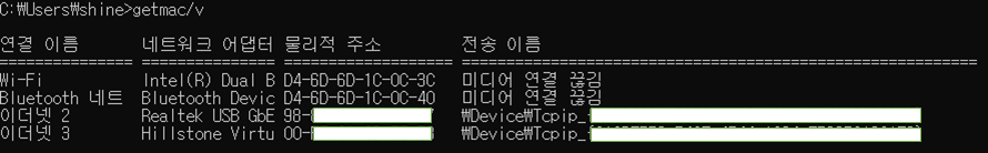그래서 찾은 방법은 현재 상태가 사용중인 네트워크 어댑터의 MAC 주소를 가져오는 것.